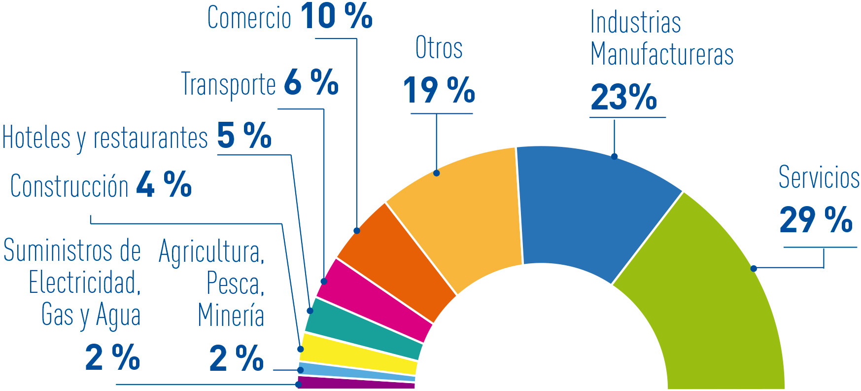 Se destaca una alta proporción de participantes en el sector de servicios, con casi un 30%, mientras que la segunda categoría con más participantes es el sector de industrias manufactureras con un 23% seguido el sector comercio con el 10%.