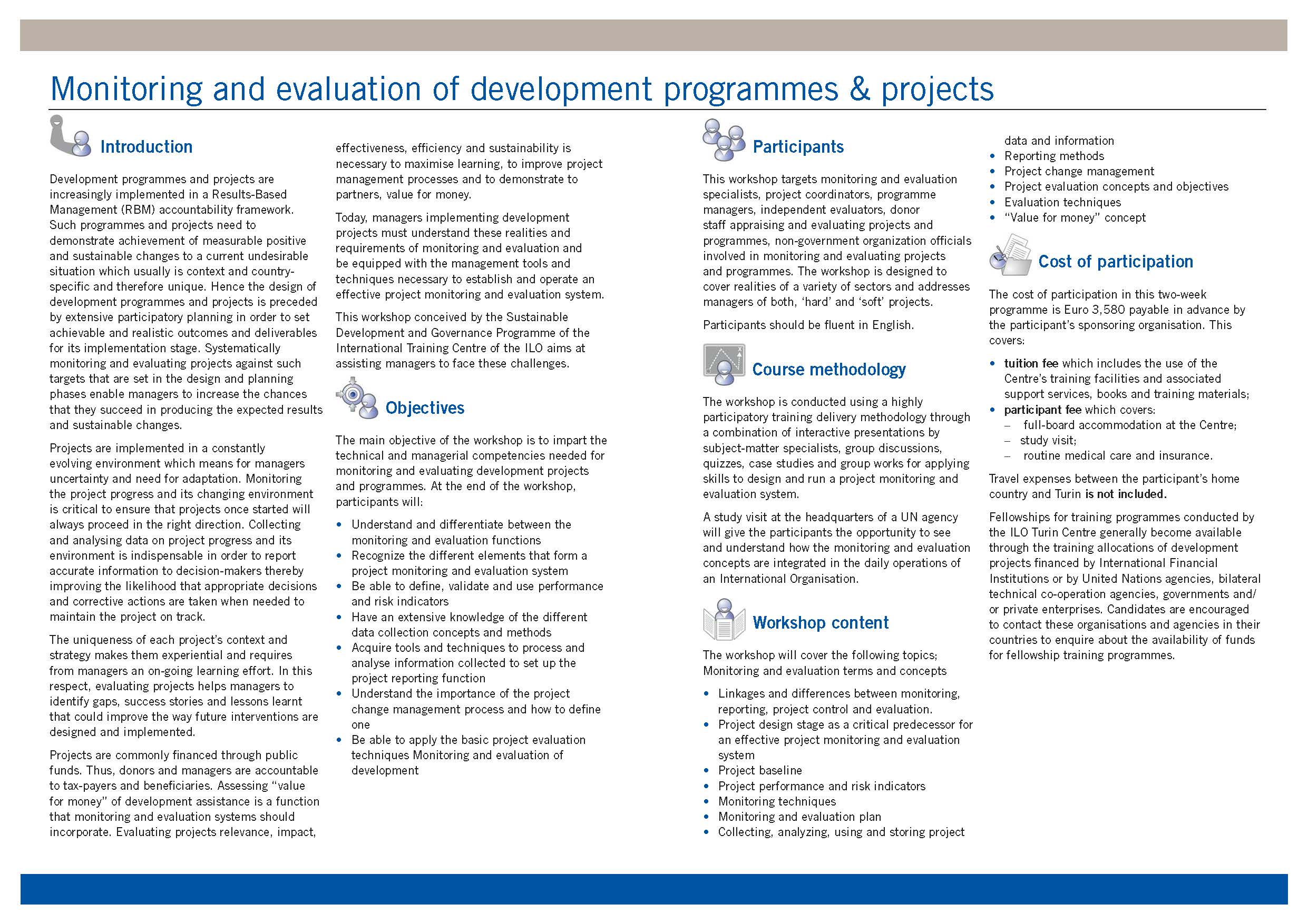 The main objective of the workshop is to impart the technical and managerial competencies needed for monitoring and evaluating development projects and programmes.
